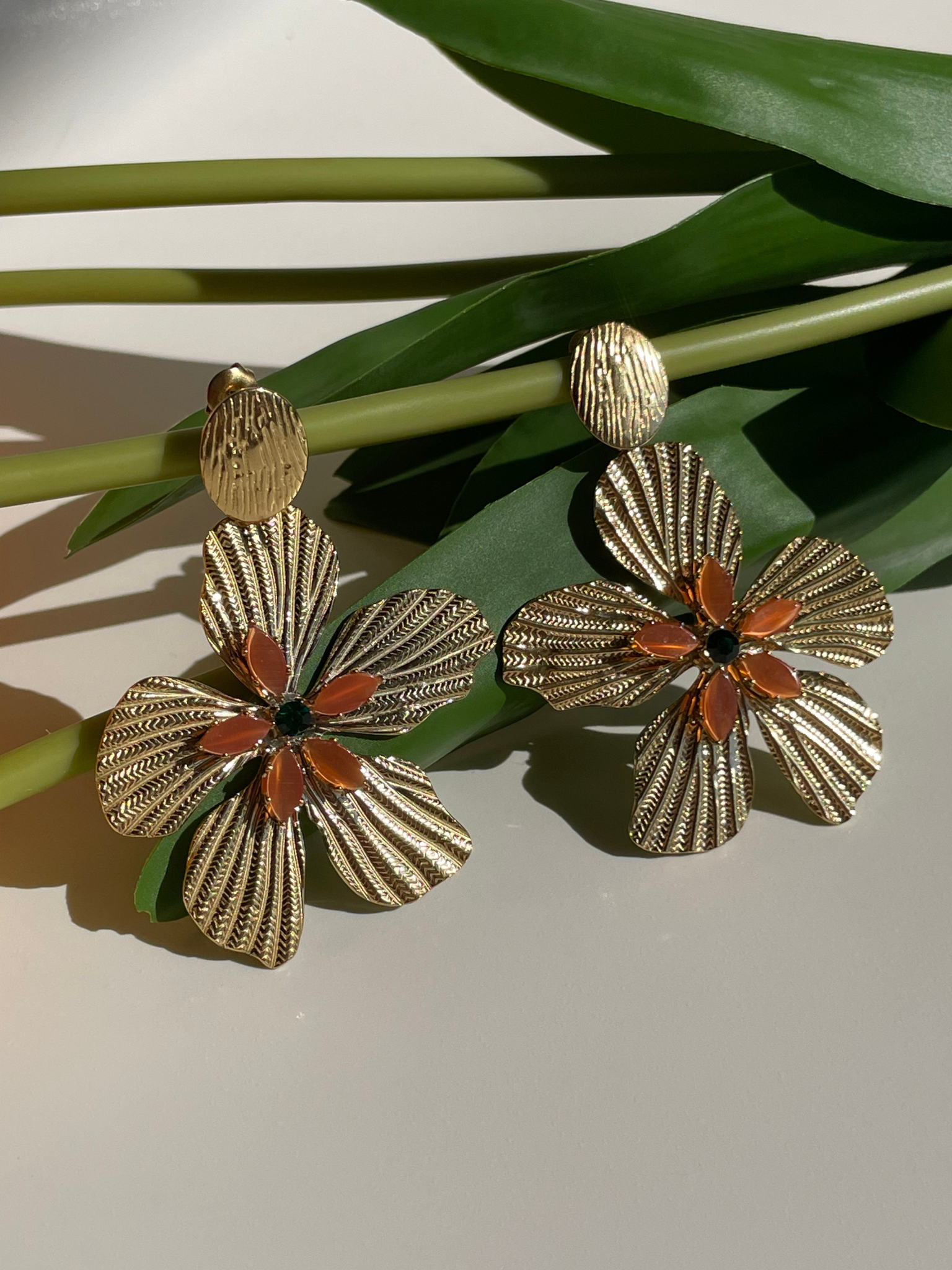 Boucles d'oreilles en forme de fleur en acier inoxydable doré, avec petits détails oranges et verts.